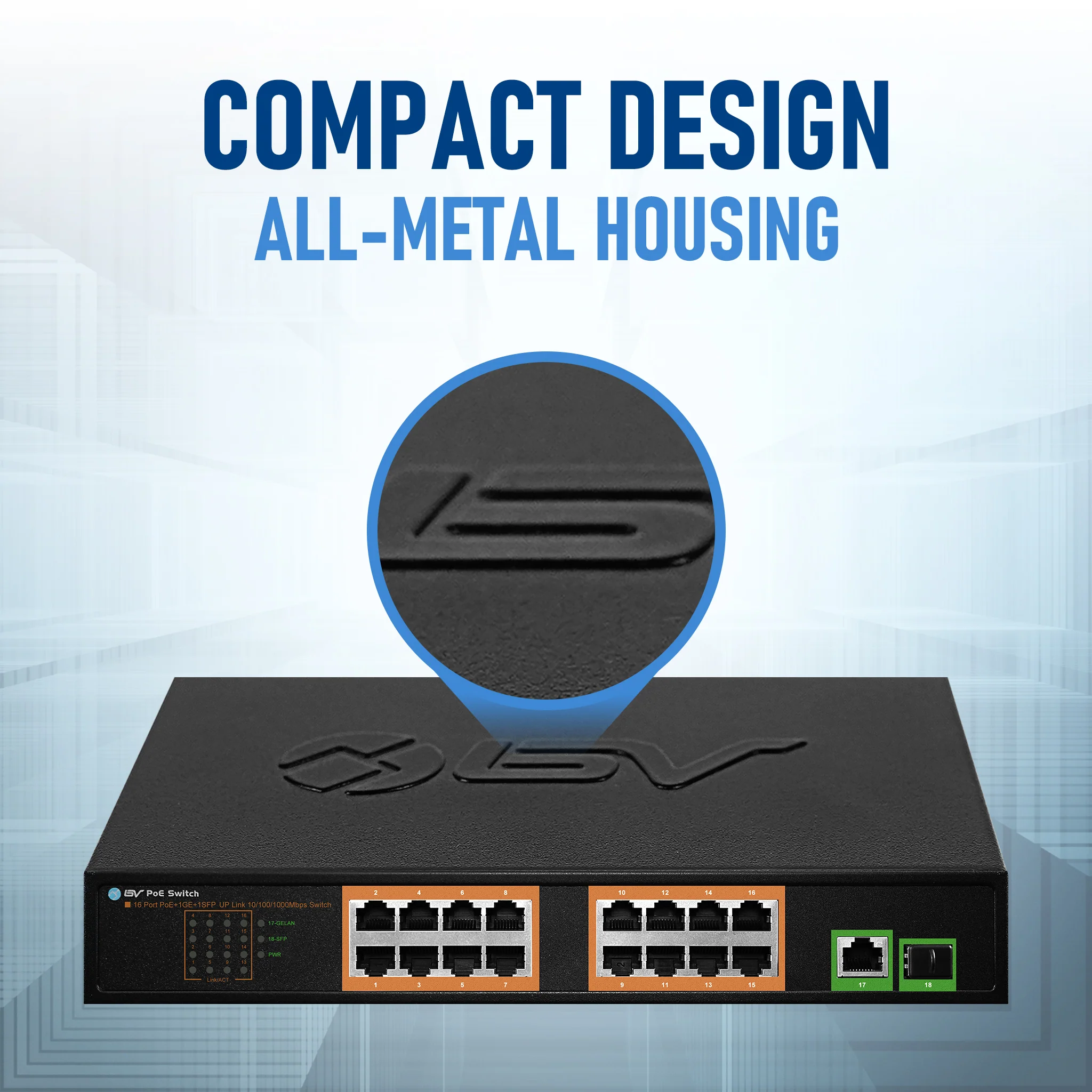 Upgrade your network with the BV-Tech 16-Port Gigabit PoE+ Switch, designed to meet the needs of small businesses and workgroups. This powerful switch offers a seamless integration of data and power over Ethernet, reducing cabling requirements. It also eliminates the need for dedicated electrical outlets, thereby simplifying installation and reducing costs.