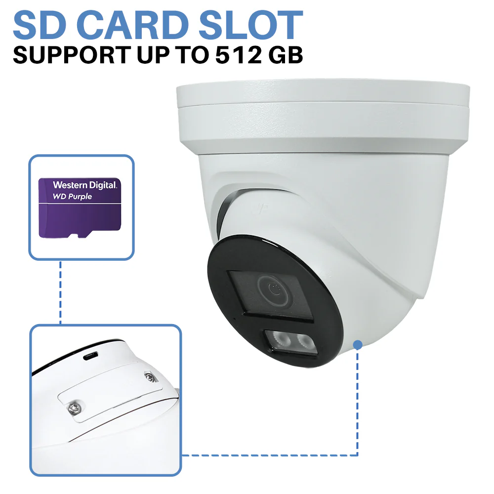 This 8MP fixed turret network camera is a high quality camera at a reasonable price. It includes a built-in microphone for real-time audio security. It includes IP67 weatherproofing to allows for operation in a variety of different environments. The camera supports up to 30m of IR range. The SD card slot supports up to 512 GB of storage.